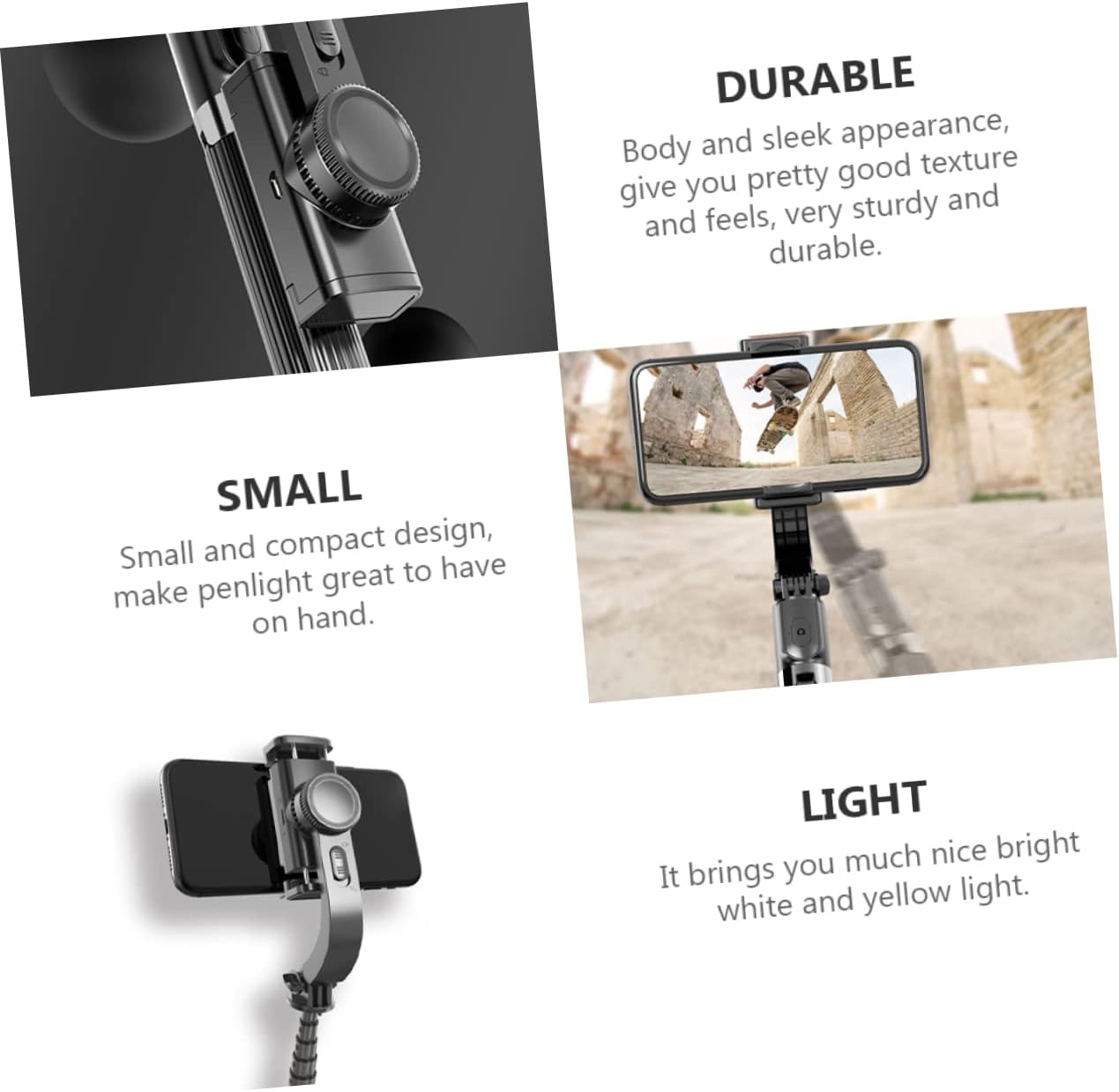 Package List 1 x set of mobile phone stabilizer Features -Color: Black handheld gimbal stabilizer. -Material: ABS gimbal stabilizer for smartphone. -Support phone size: 4.0-6.2inches cell phone gimbal. -Size: About 21.00X5.70X8.70cm / 8.25X2.24X3.42inch phone stabiliser for filming. -RX battery: 450mAh mobile phone stabilizer. -360 degree rotation, universal adjustment, you can put phone at any angle gimbal stabilizer. -The phone holder lets your phone take photos easily and conveniently smartphone camera grip. -450mAh capacity battery, to meet your daily beauty needs handheld stabilizer. -It can be used as a handheld selfie stick or a practical triangle stand gimbal for smartphone. -This stabilizer can help you take more high definition photos when you moving phone camera stabilizer.Goods Informationmobile phone gimbal Updated sports mode allows you to shoot incredibly smooth shots even while extremes like running up & downstairs, cycling outdoors, or traveling over.tripod for smartphone Made of ABS material, durable for use.mobile phone stabilizer This is a mobile phone tripod