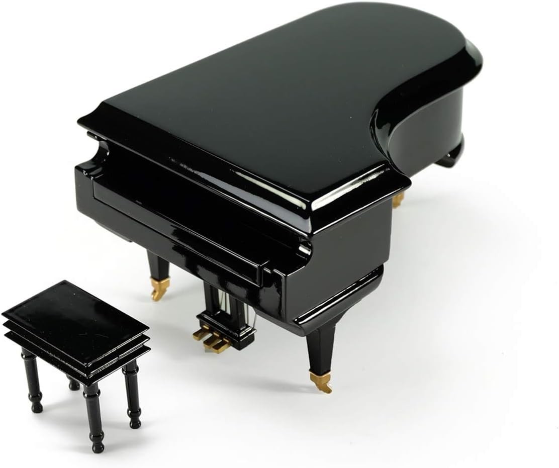Bring the magic of music into your home with the 18-Note Miniature Grand Piano Music Box from Music Box Attic. This beautifully crafted piece is more than just a music box—it's a statement of elegance and artistry. Expertly designed with a sleek, high-gloss black finish, it captures the classic charm of a grand piano in a compact size, making it a perfect addition to any room or display. Open the lid, and you'll be greeted by the sweet melody of song you chosen to create a nostalgic and heartwarming atmosphere. Every detail of this miniature piano has been carefully considered, from the glossy black exterior to the delicate white and black keys. Inside, the 18-note movement delivers a crisp and clear sound, bringing each note to life with remarkable precision. The music box mechanism is visible under the lid, adding to the charm and allowing you to see the music in action as it plays.Compact yet eye-catching, this music box measures just the right size to fit on a nightstand, shelf, or desk. It's an ideal gift for music lovers, collectors, or anyone who appreciates the beauty of a finely crafted keepsake. Whether you're celebrating a special occasion or simply want to add a touch of musical elegance to your home, this miniature grand piano music box is sure to delight. Designed with quality and care, this music box is built to last. The smooth, polished surface reflects light beautifully, and the delicate gold accents on the lid and pedals provide a subtle touch of sophistication. Let the soothing melody of your choice, fill your home with warmth and joy. Elevate your décor and create lasting memories with this timeless treasure.